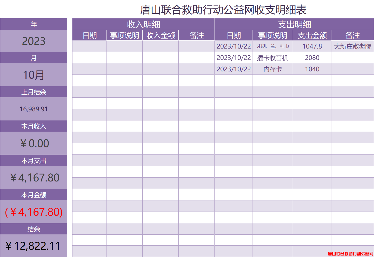 2023年11月唐山联合救助行动公益网收支明细表