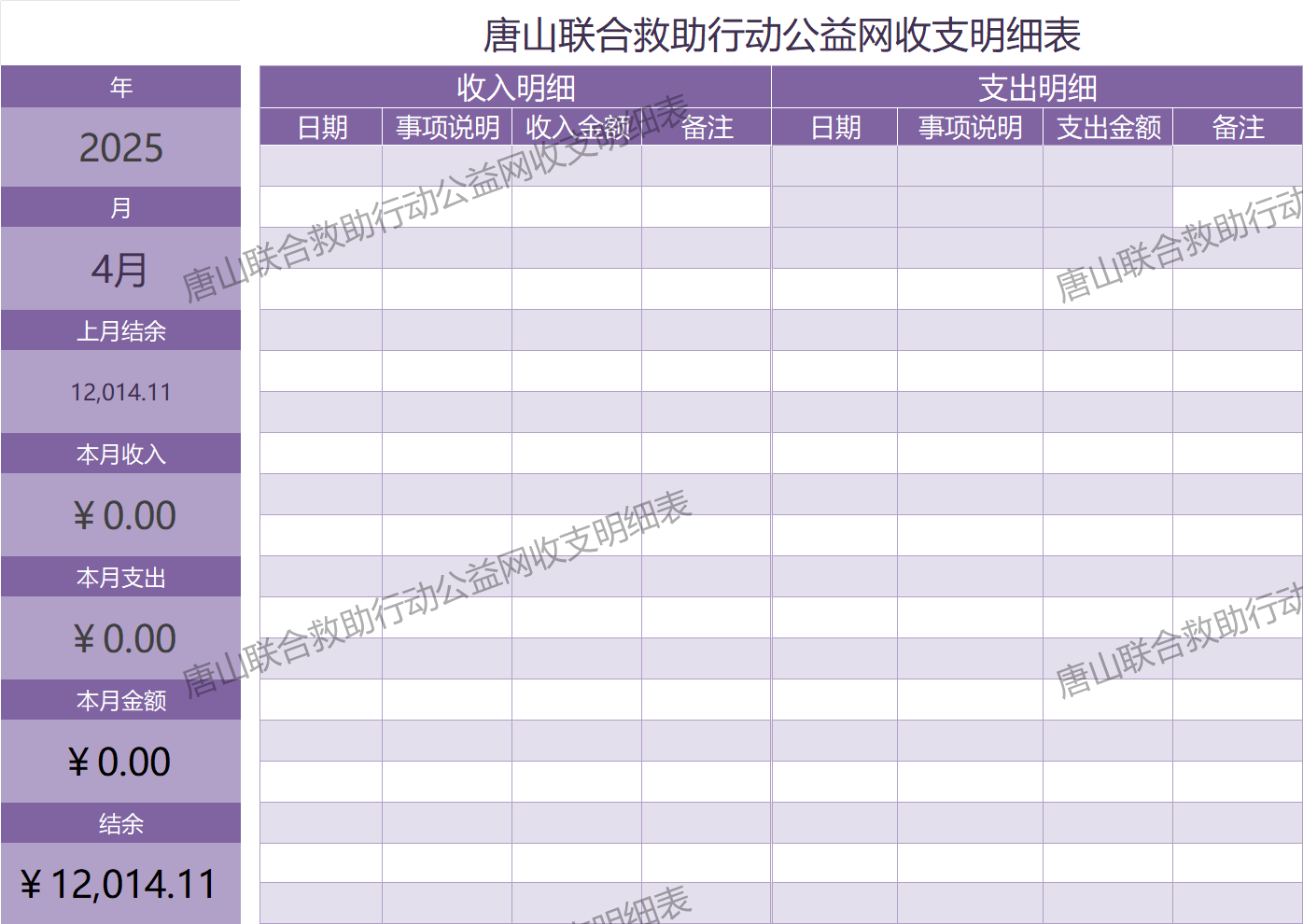 2025年4月唐山联合救助行动公益网收支明细表